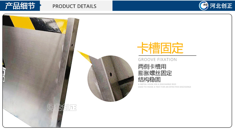 不銹鋼擋鼠板表面經(jīng)防腐處理。擋板上部貼有黃黑相間的反光條,起到警示作用。